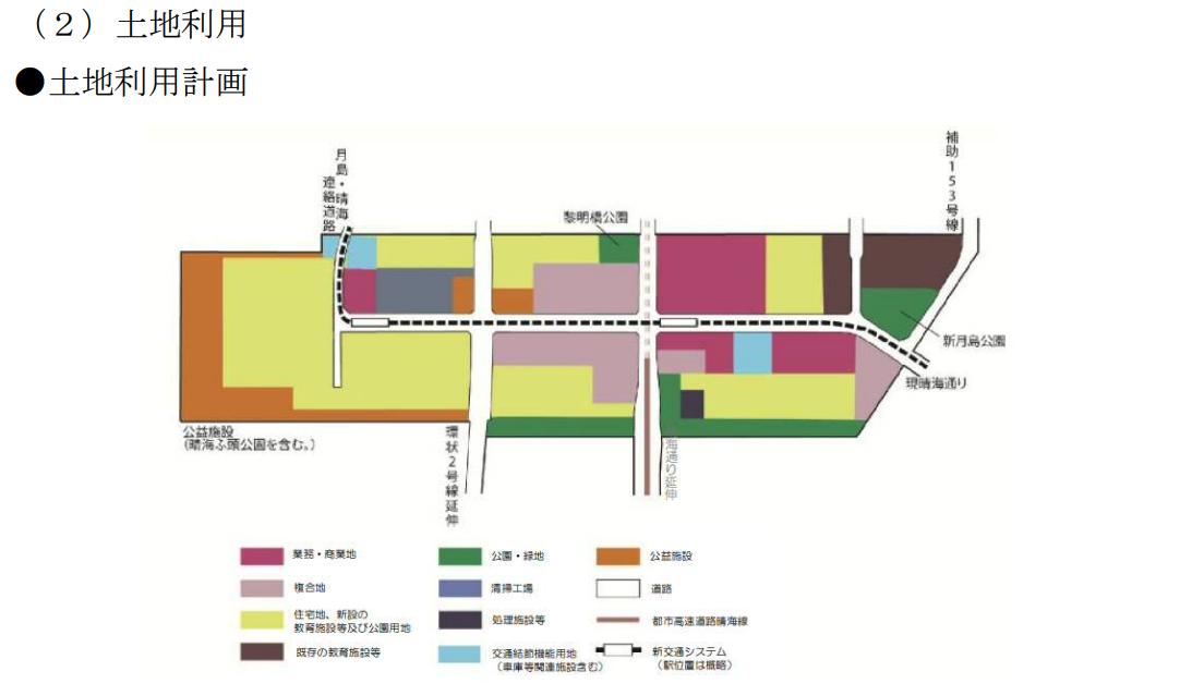 土地利用計画図に、ゆりかもめ延伸がまだ載っているのはご愛嬌。ゆりかもめは来ま…せん!改定版では、臨海地下鉄新線のルートや駅前などの土地利用の見直し、晴海西小中の反映なども行われるでしょう。